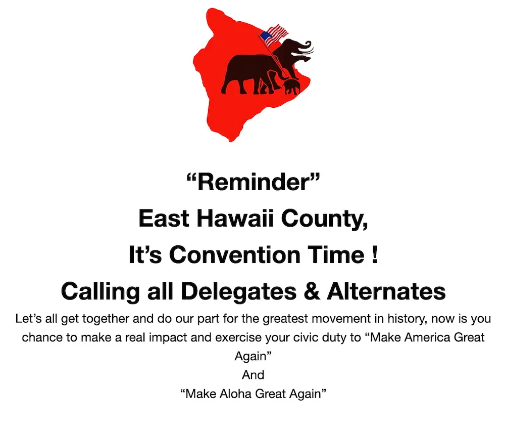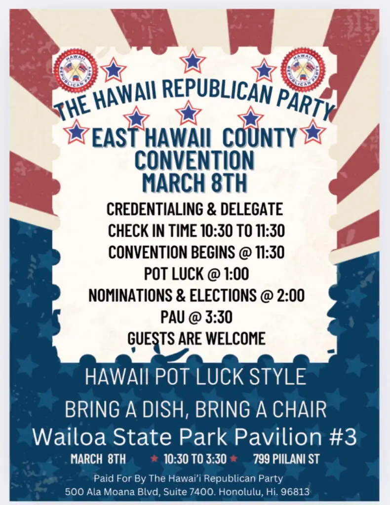EAST HAWAII COUNTY GOP ANNUAL CONVENTION SAT 8 MARCH, 2025 By Ralph No Comments on EAST HAWAII COUNTY GOP ANNUAL CONVENTION SAT 8 MARCH, 2025 1 Min Read