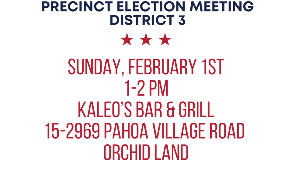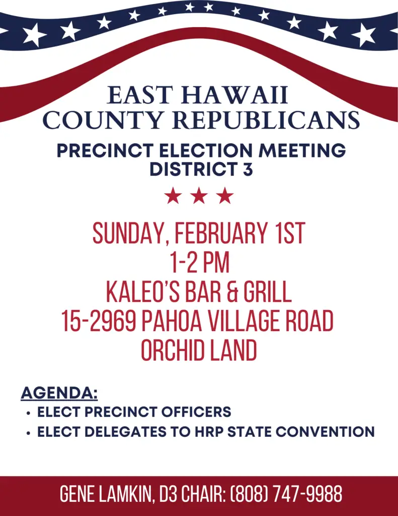 Join us for the East Hawaiʻi County Republicans Precinct Election Meeting as we come together to elect leaders, plan ahead, and strengthen our community. We’d love to see you there! ⭐️⭐️⭐️