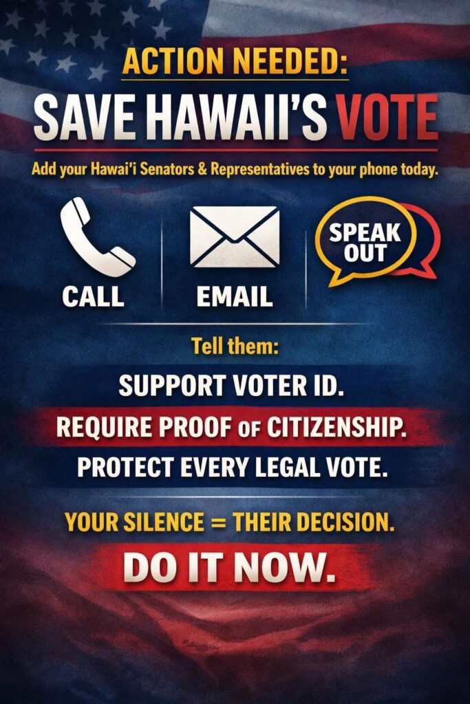 “I’m a Hawaiʻi voter. I’m asking you to support strong election integrity measures, including proof of citizenship for federal voter registration and voter ID protections. Please stand for legal voters and protect confidence in our elections.”